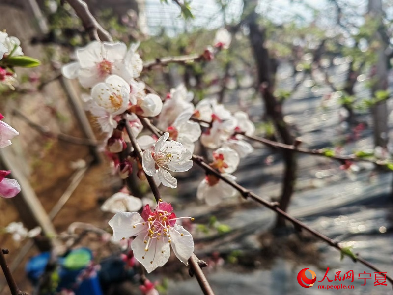 人民网银川2月15日电(李甜甜)立春过后,气温回暖,在银川市永宁县望洪镇农丰生态园温棚里,樱桃花杏花悄然绽放。